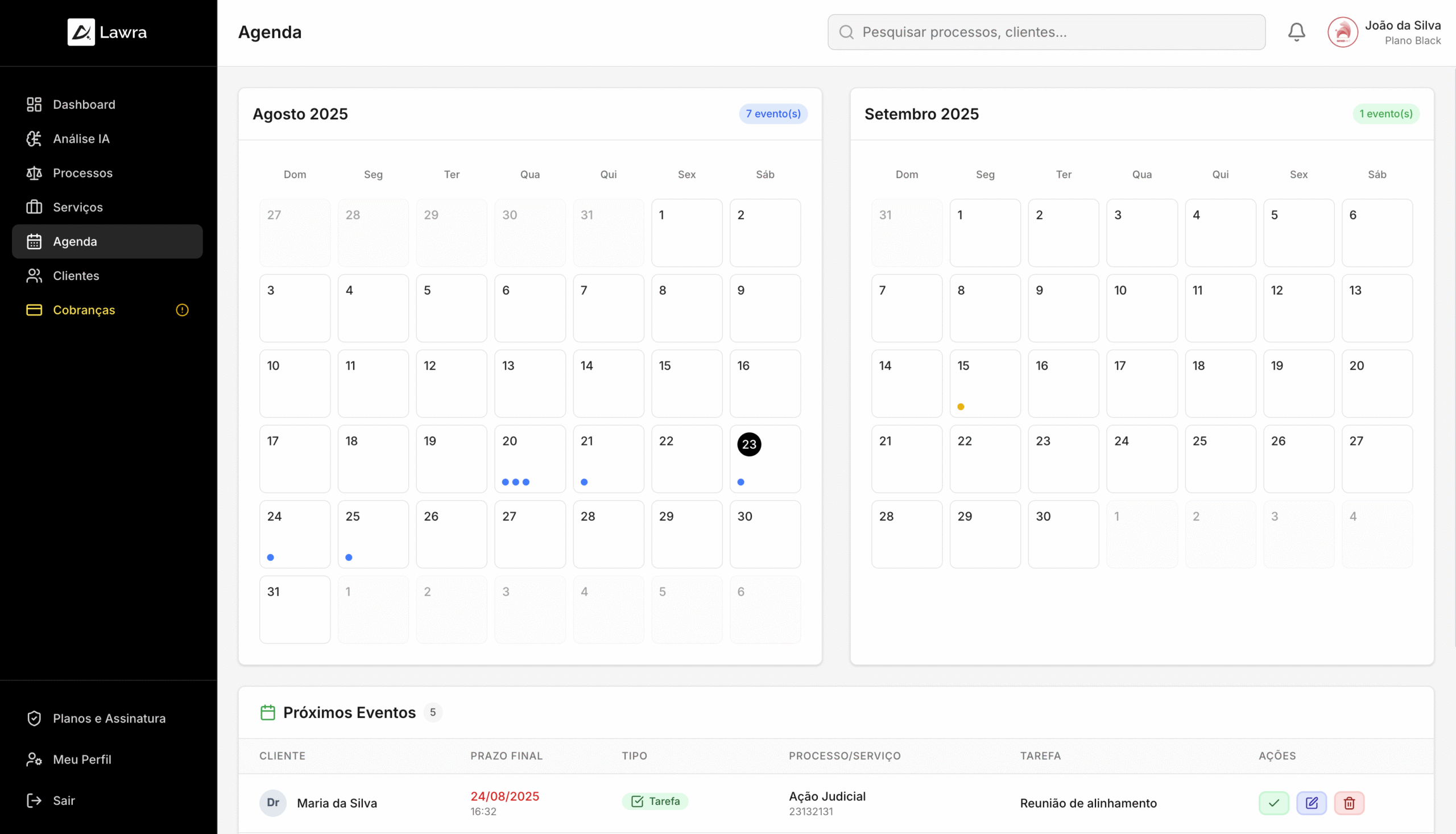 A sincronização com Google ou Outlook garante que compromissos, audiências e reuniões fiquem alinhados com sua agenda pessoal.