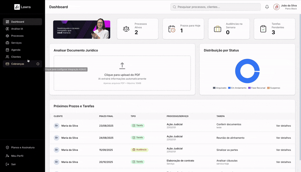 É uma funcionalidade exclusiva dos nossos planos Premium que transforma o seu WhatsApp em um assistente. Você pode enviar um PDF e receber a análise completa diretamente no seu celular, ou fazer consultas rápidas sobre seus processos e agenda usando comandos de texto. É a sua advocacia na palma da mão, onde quer que você esteja.